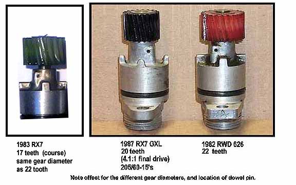 FYI, If you cannot find a 626 or late model Miata unit then you can make one by using the abundant 1979-83 RX-7 17 tooth coarse gear drive, which is the same diameter as the 22 and 23 tooth fine tooth drives. This makes the housings interchangable and then only the drive gear itself (22 tooth = part number 8854-17-441A) needs to be purchased.