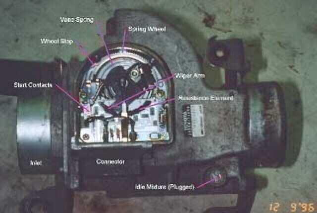 where it was. This is accomplished by opening the big plastic cover and adjusting the spring tension (Never unscrew the connector as you will damage the soldered connections). After removing the the plastic door, remove the spring holddown screw. Keep your finger on the spring to keep it from uncoiling (mark a reference point with a marker just in case). Then just move the spring X number of backing plate clicks (see also links page to procedure for MR2 flowmeter).